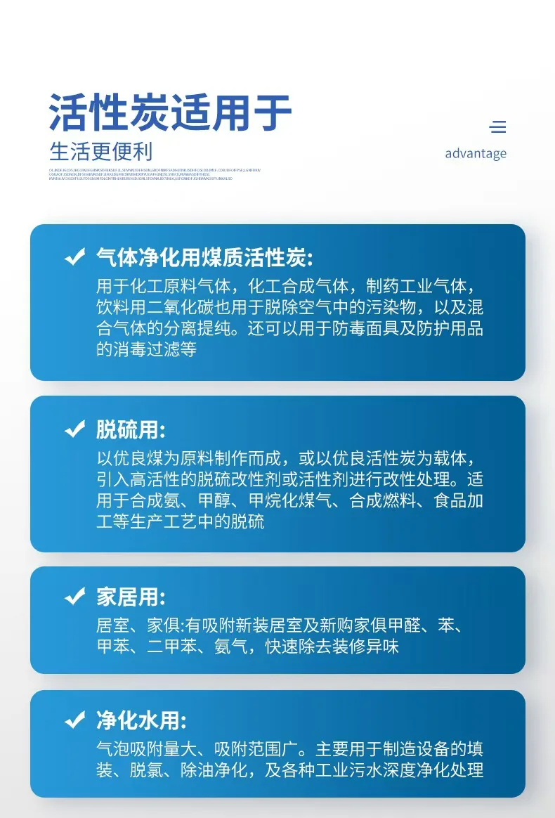 1、饮料用活性炭:由锯末经独特的磷酸工艺制成。具有介孔结构,吸附容量大,过滤速度快等优点。主要用于各种可乐、果汁、葡萄酒等饮料和饮用水的净化。